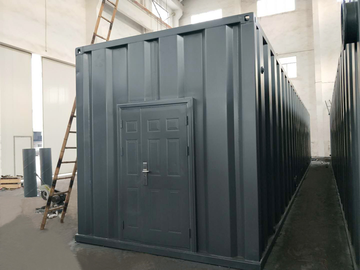 集裝箱式一體化污水凈化設(shè)備的重要部件是膜生物反應器(MBR)。污水進入MBR系統(tǒng),A區(qū)為兼氧區(qū),放置填料,并與活性污泥進行充分接觸;O區(qū)為好氧區(qū),放置膜組器,使用MBR膜將活性污泥和大分子有機物質(zhì)截留住,省掉二沉池。活性污泥濃度因此提高,水力停留時間(HRT)和污泥停留時間(SRT)可以分別控制,而難降解的物質(zhì)在反應器中不斷反應、降解。進一步處理之后,被處理水可以達標排放或回用。此外,輸送到MBR系統(tǒng)中的空氣也是處理過程中重要的一部分,它可以促進反應器中流體的循環(huán)流動,提高活性污泥的降解效率,還可以使中空纖維膜膜絲之間發(fā)生相互摩擦,清潔膜組件。